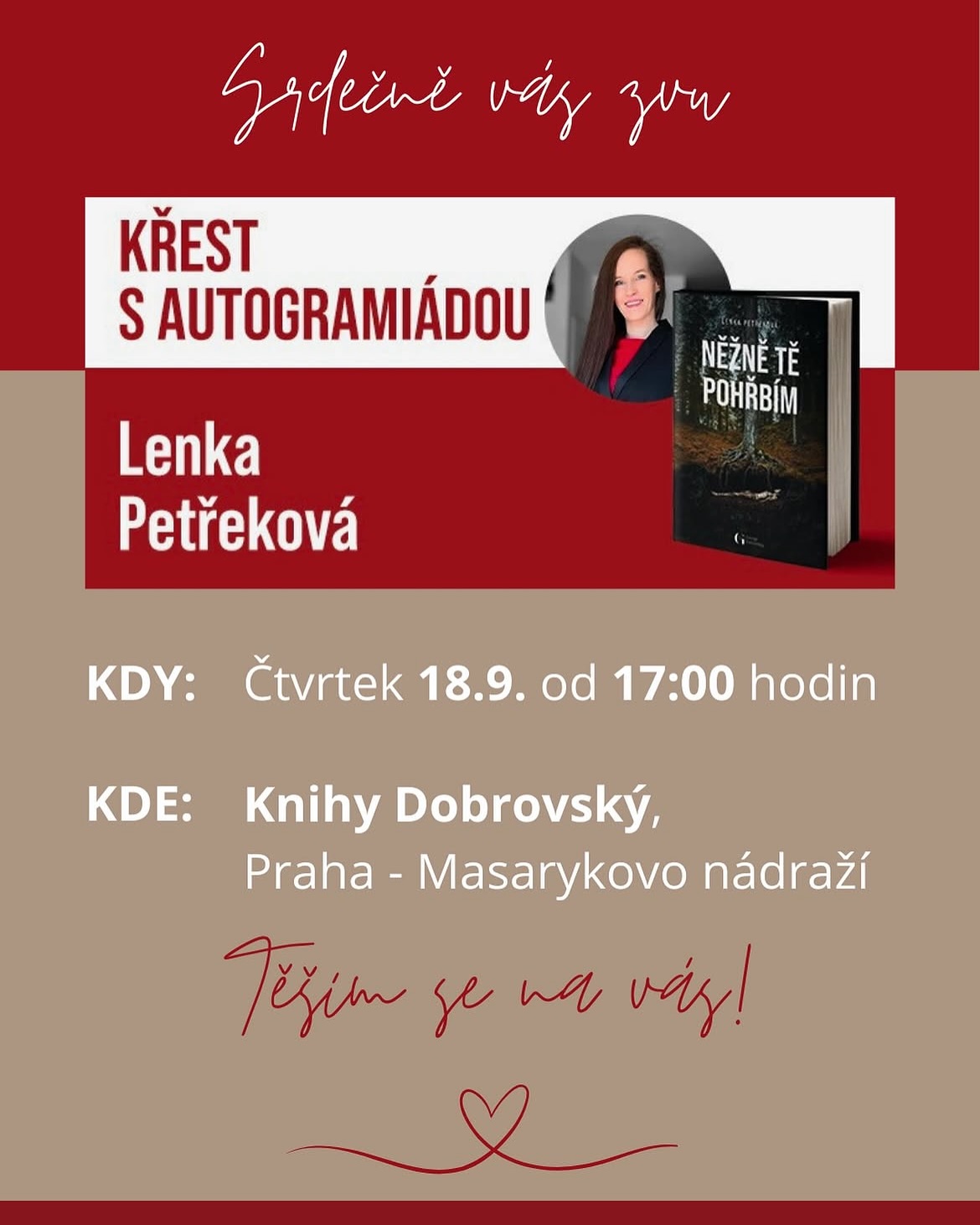 Jen ještě dodám, že ve čtvrtek 18. září 2025 proběhne křest (viz informace níže). A já budu mít tu čest být kmotrou… Tak přijďte za námi na pražské Masarykovo nádraží a popřejeme společně Lence Petřekové a její knize úspěšnou cestu literárním světem!